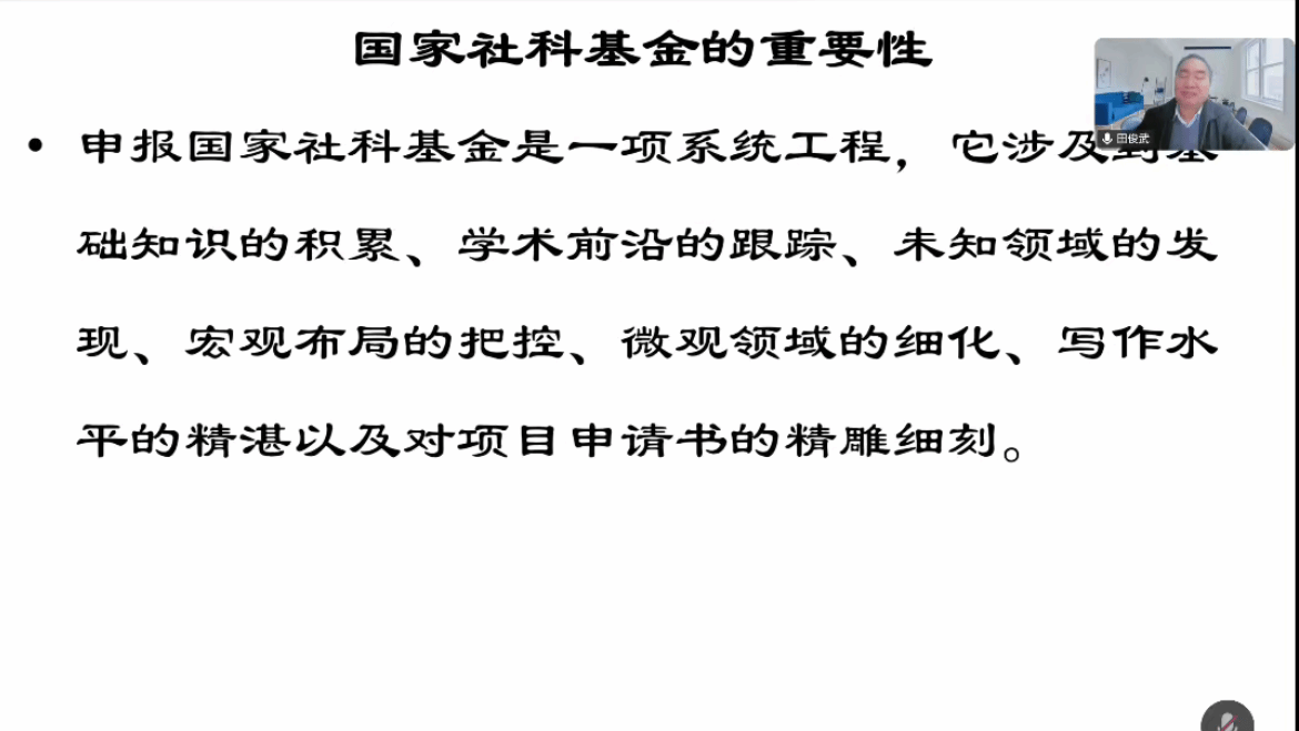 第二场报告题为“从国家社科基金后期资助项目到国家社科基金重大项目——国家社科基金项目申报探微”。田俊武教授结合其在国家社科基金后期资助项目、年度项目及重大项目等多类别项目申报方面的成功经验,围绕国家社科基金重大项目、一般项目、后期资助项目、中华学术外译项目、冷门绝学项目等不同类型的定位特点与申报逻辑展开深入解析,重点讲解申报路径选择与申报书撰写的关键环节,提示当前项目设置的热点议题与问题趋势,帮助教师提升选题论证质量、研究设计的规范性与文本表达的精准度,为后续申报工作提供了针对性指导。